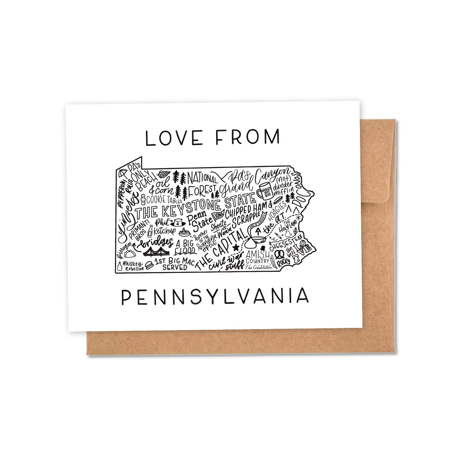This Pennsylvania state map greeting card by Shop Like You Live Here is brimming with delightful, hand-drawn details celebrating the essence of life in PA — from the bridges of Pittsburgh to chipped ham and scrapple. This all occasion greeting card is perfect for Pennsylvania locals and visitors alike.